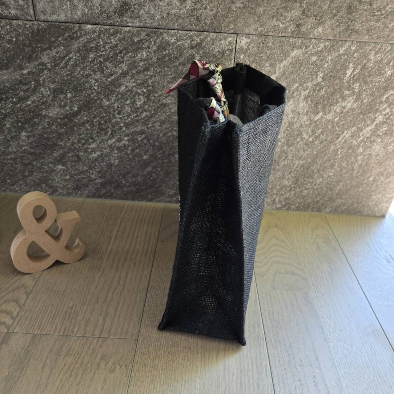 この黒ジュートバッグは、ナチュラルな素材感とシンプルなデザインが魅力です。