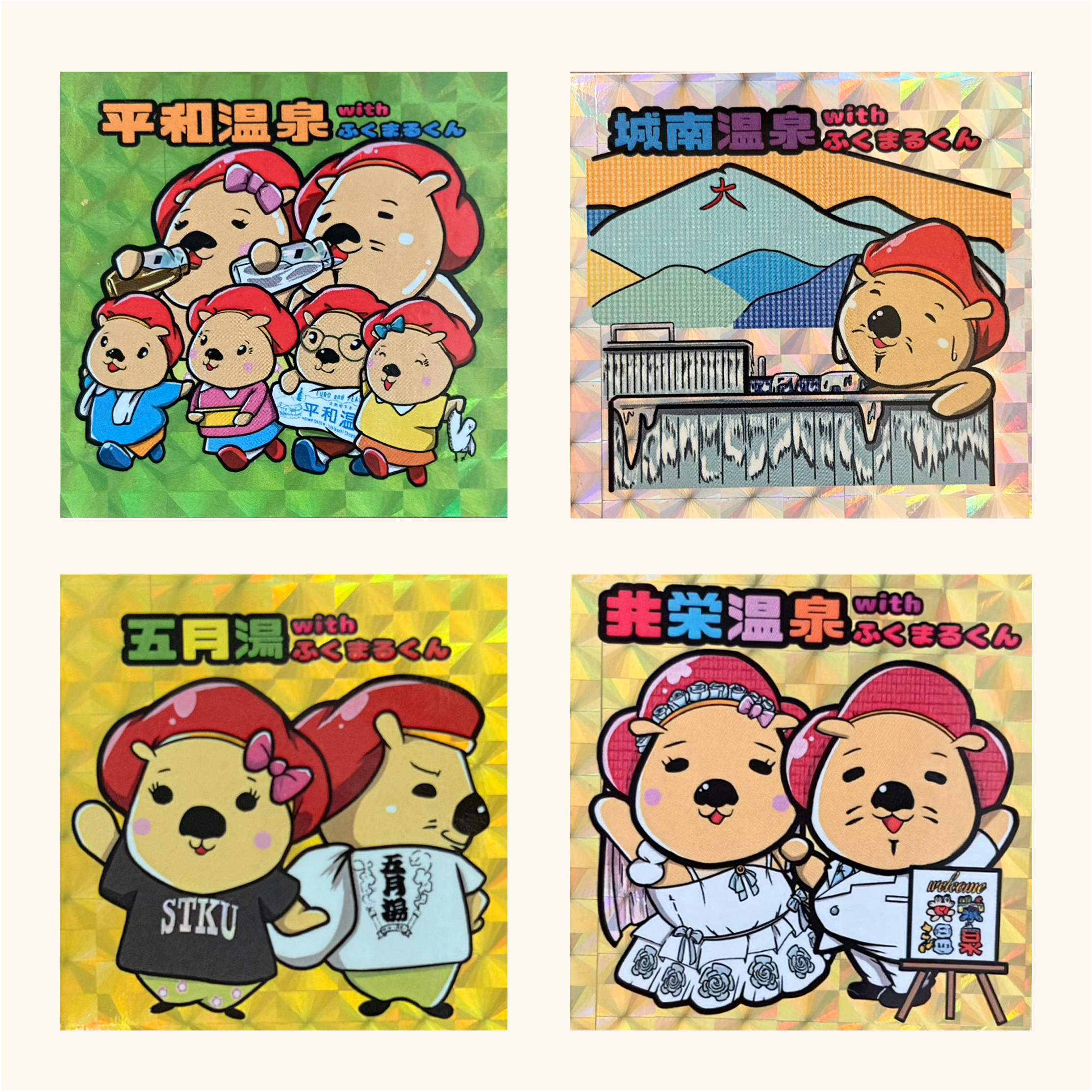 取り扱い店舗拡大中のビックリマンシール風「銭湯マンシール」今回は池田の銭湯とふくまるくんがコラボ?!池田の代表的な4つの銭湯のセット販売です。